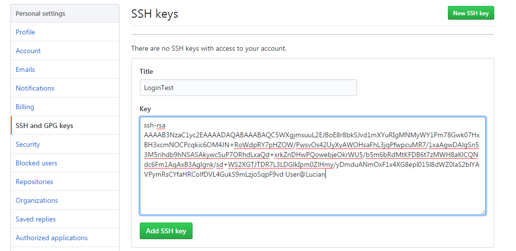 然后在github的Personal settings中添加它,title隨意,可以用Home,company等作為標識來區(qū)別。