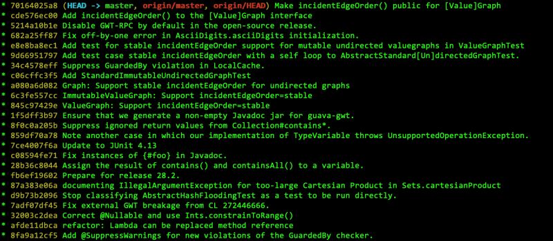 # 指定文件夾 loggit log --pretty=format:"%h %cn %s %cd" --author="iisheng/|勝哥" --date=short src# 查看指定用戶指定format 提交 git log --pretty=format:"%h %cn %s %cd" --author=iisheng --date=short # 查看該文件的改動歷史git log --pretty=oneline file# 圖形化查看歷史提交git log --graph --pretty=oneline --abbrev-commit# 統計倉庫提交排名前5git log --pretty='%aN' | sort | uniq -c | sort -k1 -n -r | head -n 5# 查看指定用戶添加代碼行數,和刪除代碼行數git log --author="iisheng" --pretty=tformat: --numstat | awk '{ add += $1 ; subs += $2 } END { printf "added lines: %s removed lines : %s /n",add,subs }'