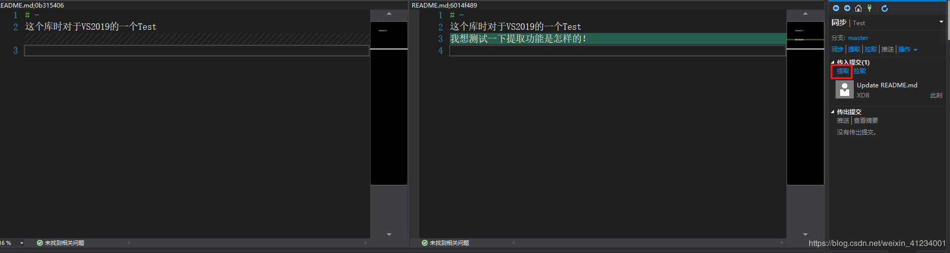 提交(VS點擊更改會跳轉到提交頁面):只會記錄您在本地計算機上所做的更改。它不會標記遠程存儲庫中的更改。 提取:只獲取遠程發生改變的項,例如下圖所示,點擊提取,獲取被修改的README.md文件