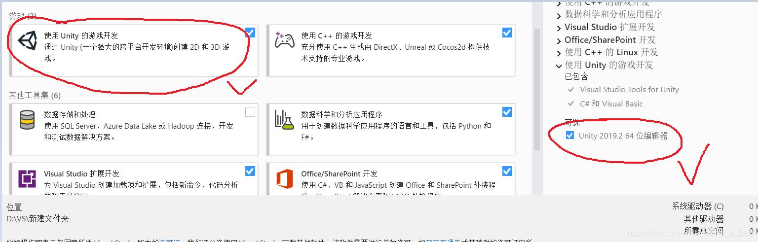 12. 此外,安裝VS2019的過程中應該安裝unity的相關組件,如下圖