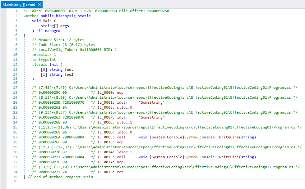 首先 var 為語法糖,編譯器在編譯時根據右值推斷出表達式類型,再由編譯器將推斷出的表達式類型寫入到 IL 中,所以如下2段代碼在 IL 中完全一致。
