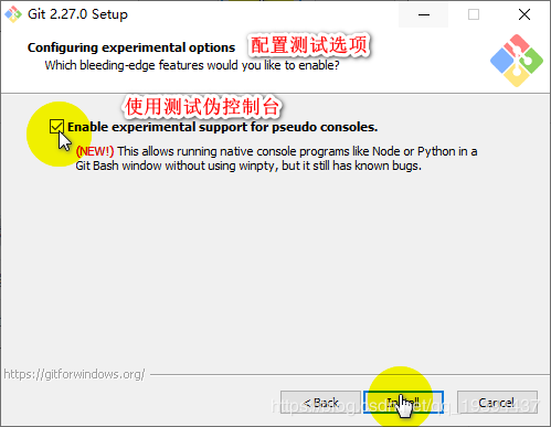 13、配置測試選項,此處勾選【Enable experimental support for pseudo consoles】,點擊【Install】,等待按照即可。