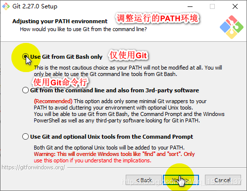 7、選擇 Git 的執行環境路徑,此處默認使用【命令行】的方式就好,點擊【Next】.