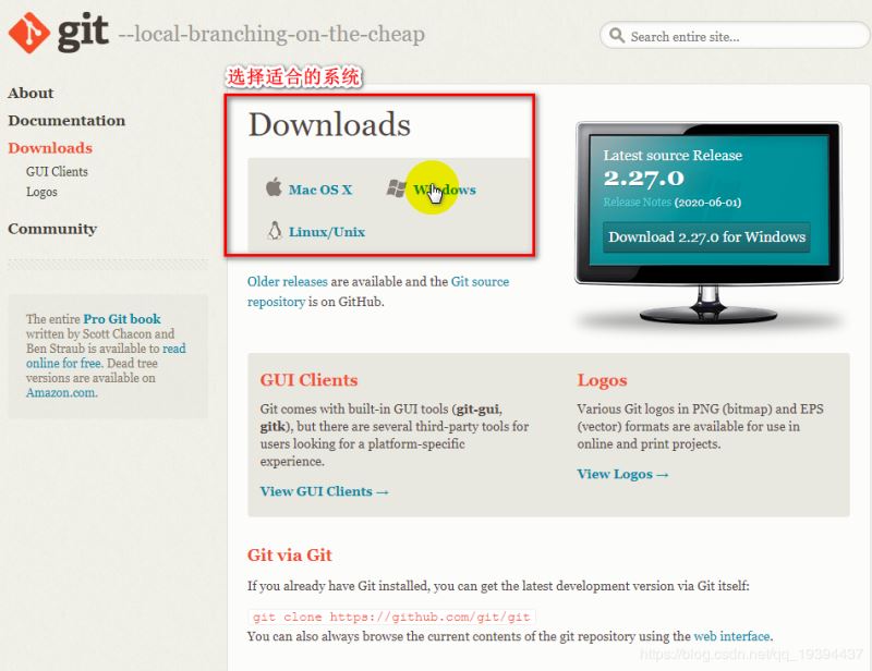 2、選擇合適的操作系統(本教程是以 Windows 系統為例),選擇 【Windows】(會根據目前的系統自行識別),等待 Git 的GUI 軟件下載,目前的版本是 v 2.27。