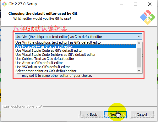 6、選擇 Git 編輯器,根據自己的情況選擇編輯器(我的電腦上有安裝Notepad++),一般就默認選擇 Vim 的方式,之后點擊【Next】。