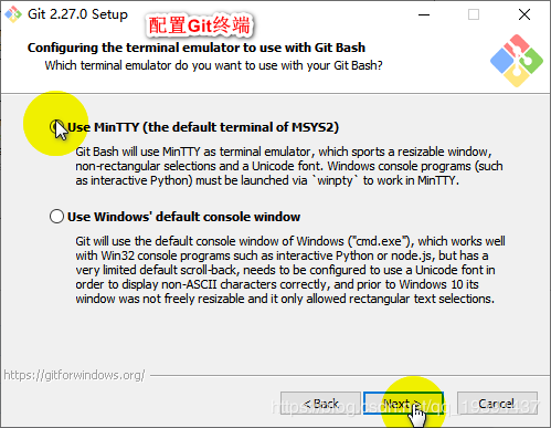 10、配置 Git 終端,使用默認【use MinTTY】,點擊【Next】。