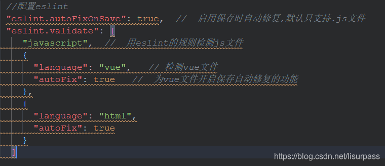 {“eslint.autoFixOnSave”: true,“eslint.validate”: [“javascript”,{“language”: “vue”,“autoFix”: true},{“language”: “html”,“autoFix”: true}]}