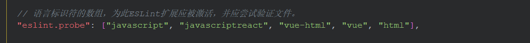 {“editor.codeActionsOnSave”: {“source.fixAll.eslint”: true},“eslint.probe”: [“javascript”, “vue”, “html”]}