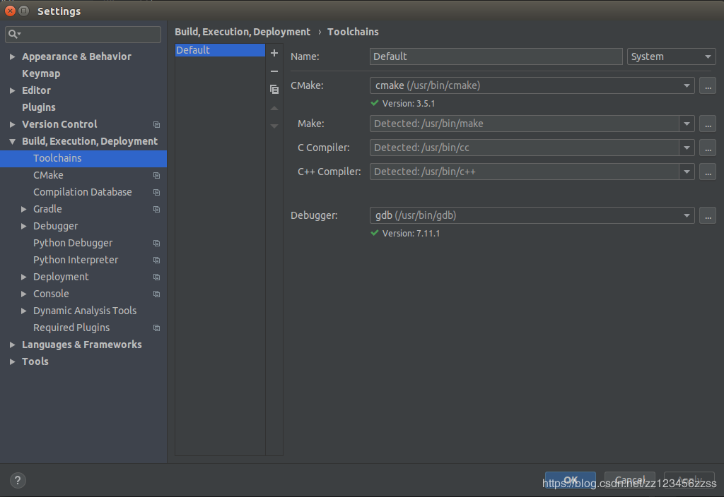 默認(rèn)情況下,CLion編譯使用的CMake是其內(nèi)置的一個(gè)版本,而使用這個(gè)版本的CMake進(jìn)行編譯時(shí)會(huì)報(bào)出一些莫名其妙的錯(cuò)誤,命令行中catkin_make明明可以正常編譯,而這里就是會(huì)失敗。解決這個(gè)問(wèn)題的辦法就是將CLion中的CMake更換為系統(tǒng)中的CMake,具體設(shè)置在Settings->Build->Toolchains,可以看到其中的CMake默認(rèn)為Bundled,我們需要手動(dòng)指定為系統(tǒng)中的CMake,具體看下圖: