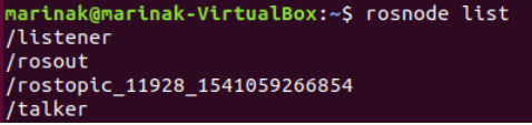 您可以通過該rosnode list命令檢查當前運行的節點列表。在我們的示例中,列表將包含talker和listener: