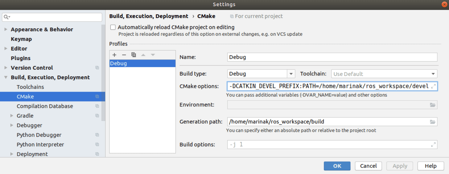 要在IDE和控制臺上進行單一構建,需要將CLion構建路徑設置為catkin工作區目錄。為此,請轉到文件|設置Ctrl+Alt+S|構建,執行,部署|CMake并更改兩個字段: