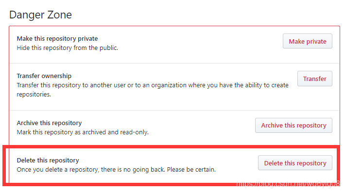 (1)在github的對應的倉庫中到Settings,滑到Setting頁面的底布,找到"Danger Zone"的最后一個子項,刪除庫
