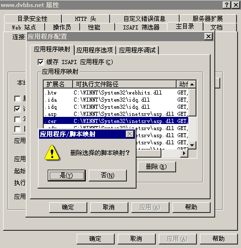 進入站點屬性,選主目錄,點配置,將不需要的腳本映射全部刪除,一般只保留.asp就可以了,其它的全部可以刪除,圖7。