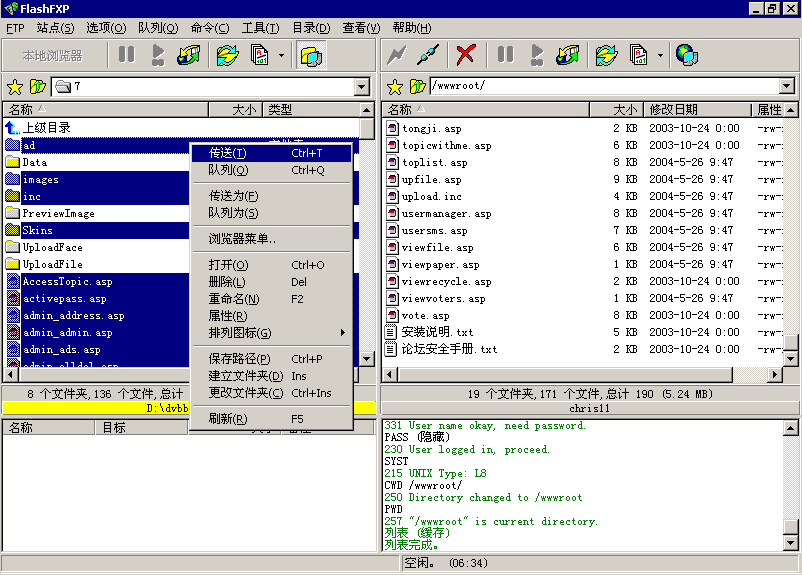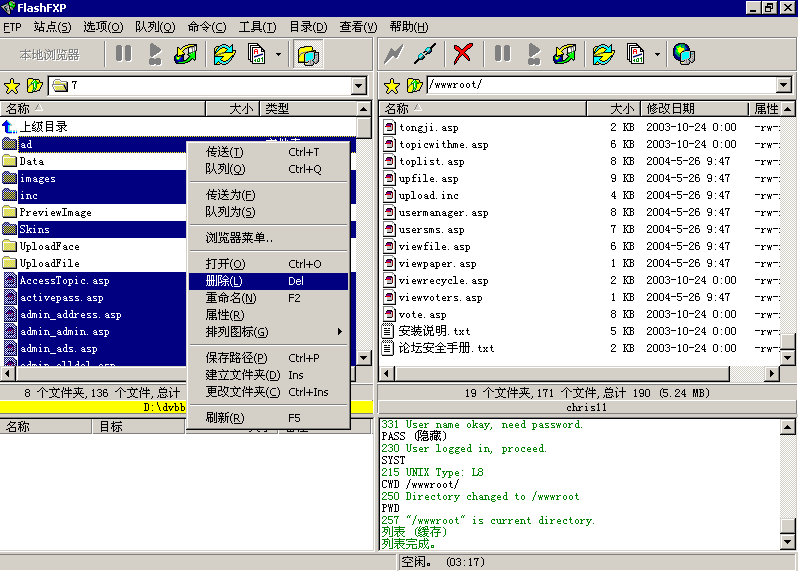 嘿嘿,沒想到沒用2分鐘就解決了問題,我正在得意,突然想到如果黑客修改了正常的文件增加了惡意代碼怎么辦?文件內容用Ftp可沒辦法查,只能全部下回來了查了,upload那幾個目錄有好幾百M,我就不下了,只要確保里邊沒有asp等可執行文件就行,數據庫也不用下了,其它文件都通通下回來。圖4。