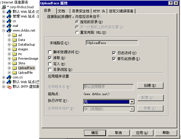 在iis中選取Uploadface,屬性,將執行許可設置為無,還需要設置的還有uploadfile,previewimage這兩個目錄,如果你愿意的話,可以將除了Inc目錄外的其它所有目錄可執行權限都設置為無。
