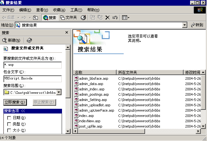 打開Windows的搜索功能,要搜索的文件名寫*.asp,想到很多木馬都有這行代碼"LANGUAGE = VBScript.Encode",而動網論壇是不用這行代碼的,于是我輸入"VBScript.Encode"來查找所有含有"VBScript.Encode"的asp文件,嘿嘿,果然找到幾個,圖6。