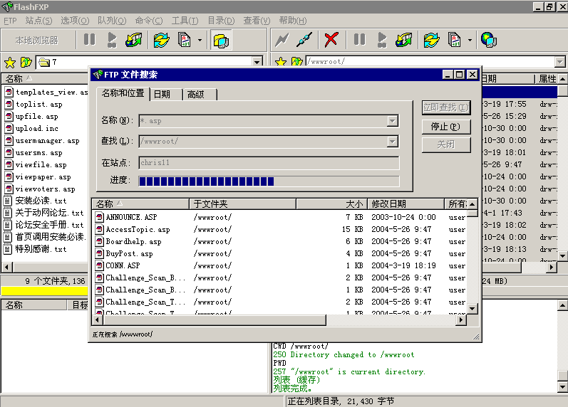 俗話說知己知彼,百站百勝。要想查木馬,首先要了解自己的網站結構,其次要了解木馬大概的組成。一個好的網站結構能快速的確定非法的文件,一個糟糕的結構會讓你自己都頭暈,簡單來說就是文件分類歸放,及時刪除過期的和測試的文件,這個話題不是我們今天的重點,有興趣的朋友請自行查找。木馬的構成就復雜多變了,一般會根據功能的不同而以各種形式出現,小一點的用幾十個字符就可以搞定。要查木馬不需要很多工具,一個Ftp軟件加上Windows自帶的搜索功能,再有個文本編輯器如Windows帶的記事本就齊備了。Ftp軟件建議用FlashFXP,在查木馬方面他有些功能比較實用。