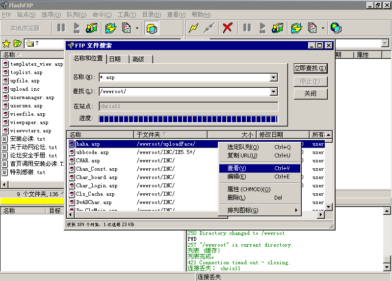 2004-5-26 21:10:36,小黑告訴我他的論壇首頁被人改了,我馬上登陸他的網站,發現論壇首頁文件被改,找他要來Ftp帳號密碼,登陸Ftp仔細查看。他的空間只放了一個動網論壇,根據頁面被改的情況分析應該是被人上傳了木馬程序修改,于是我打開FlashFxp,選擇工具,選擇在FTP服務器上查找文件,圖1。