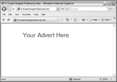 在編輯器中輸入上面的代碼,并保存為adverts.htm文件。另外,我們還需要創建三個圖形文件:advertimage1.jpg、advertimage2.jpg和advertimage3.jpg文件(或者,也可以從本書的代碼下載中獲得這三個文件)。當頁面被加載時,開始時將看到一個advertimage1.jpg圖片,如圖9-5所示。