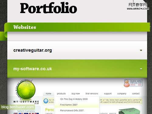 alex cohaniuc (www.alexcohaniuc.com)的滑動導(dǎo)航菜單設(shè)計的很好。把作品項目藏到滑動導(dǎo)航菜單里是的做法其實(shí)挺有道理的,因?yàn)檫@能把每個項目的不必要信息隱藏起來,等訪客有需要的時候再顯示。說這項設(shè)計好是因?yàn)椋阂唬繅K畫布的標(biāo)題都很大,很好點(diǎn)擊;二,每塊標(biāo)簽卡都使用了一個小箭頭來反映開合狀態(tài);三,鼠標(biāo)滑過時,當(dāng)前標(biāo)簽卡有將它區(qū)分出來的不同背景色。