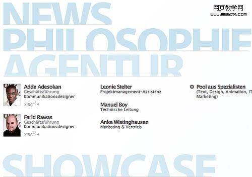 polargold(www.polargold.de/#agentur)網(wǎng)站很新穎的將滑動導(dǎo)航菜單效果用于全站的導(dǎo)航,點(diǎn)擊每一個字母標(biāo)題都展現(xiàn)該系列下的人名和作品。視覺形式上也打破了傳統(tǒng)的滑動導(dǎo)航菜單的塊狀模式,看上去清晰而活潑。