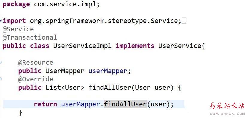 4、在userserviceableimpl.java文件調用usermapper.findalluser函數,具體代碼見下圖。