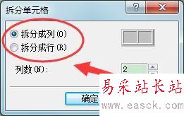 接下來的拆分單元格窗口中,可以選擇拆分成行和拆分成列,本人選擇拆分成列,列數為2。