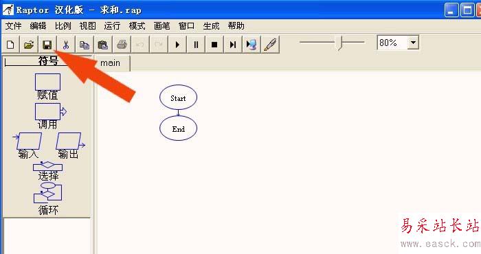 2、在運行的Raptor界面上,單擊【保存】按鈕,并準備流程圖設計。接著,在運行的Raptor界面上,單擊【保存】按鈕,根據設計的求兩數之和的要求,準備流程圖設計,如下圖所示。