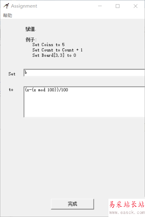 4、在第一個賦值框上方輸入 a 下方輸入 x mod 10,在第二個賦值框上方輸入b 下方輸入 (x-(x mod 100))/100。