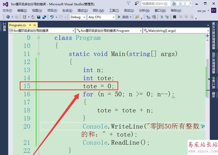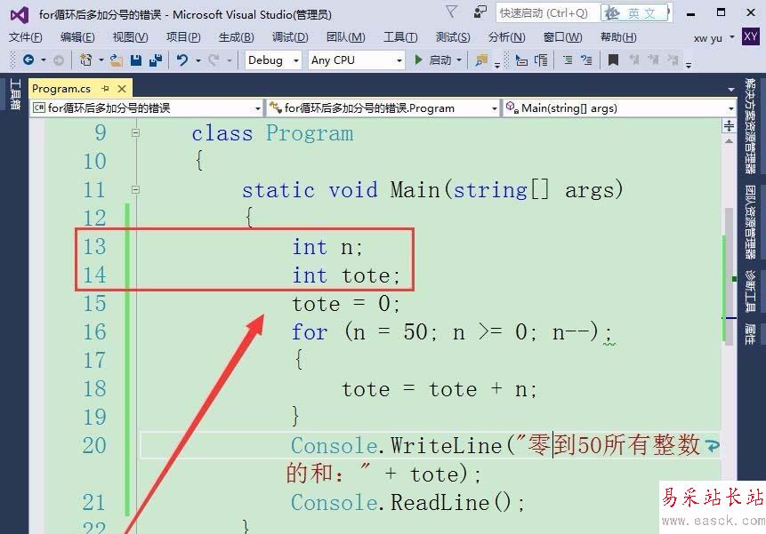 1、如果在for循環后,添加一個分號會有什么樣的錯誤呢?首先,定義一個整型變量n和tote,保存各整數以及總和。