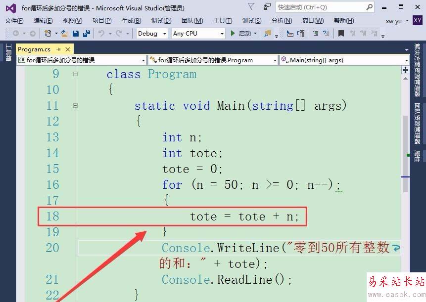 7、運行程序,在窗口中輸出的值卻是-1,這是什么原因呢?原因就在for語句后加的分號,由于在for語句后加了分號,使for語句執行的循環成為空循環,即for語句執行了51次空循環,最后一次循環中n的值變為-1,才執行累加,所以計算出的總和為-1。