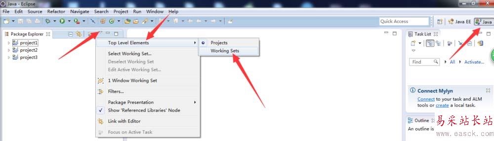 3、點擊倒三角后,下拉菜單中點擊Top Level Elements--->Working Sets,