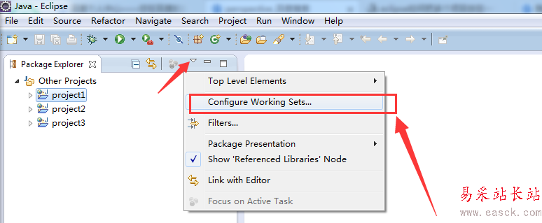 5、如果想建立文件夾可以點擊倒三角,點擊Configure Working Sets,
