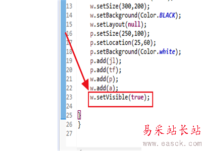 6、第六然后就到窗口顯示最重要的時刻。輸入代碼為a.setVisible(ture);。其中的ture就是使窗口可視化。就是現在運行代碼的話,窗口就可以看見了。