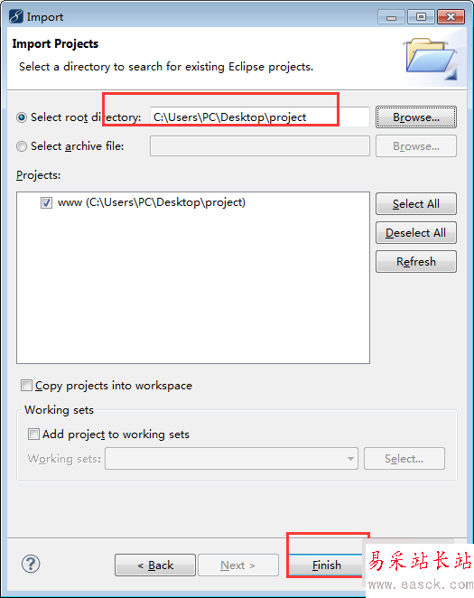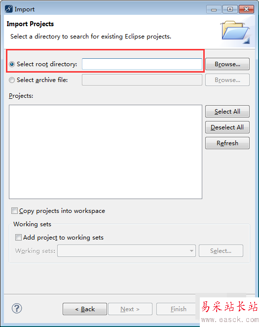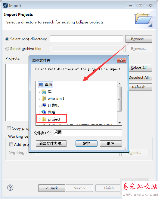 4、在彈出的二級(jí)窗體中,選擇Existing Projects into Workespace