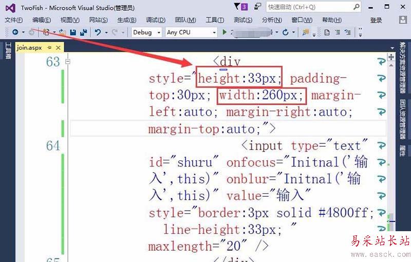 3、設置輸入文本框的高度為33像素,寬度為260像素。