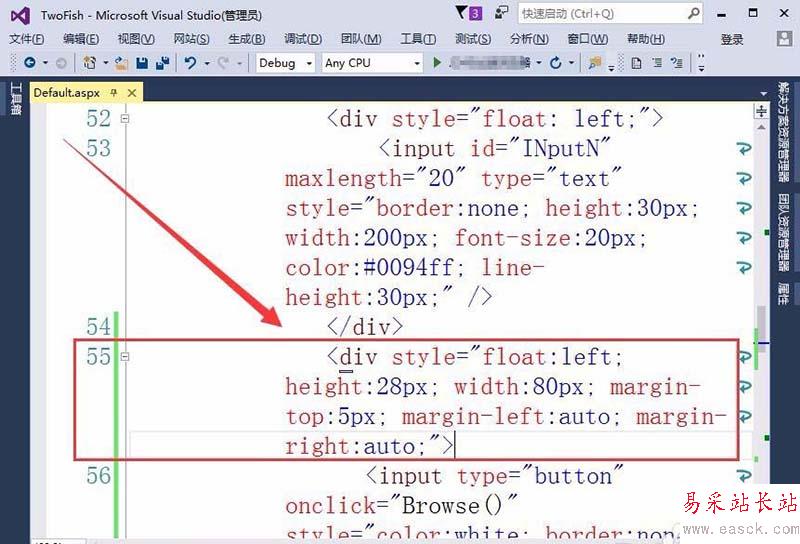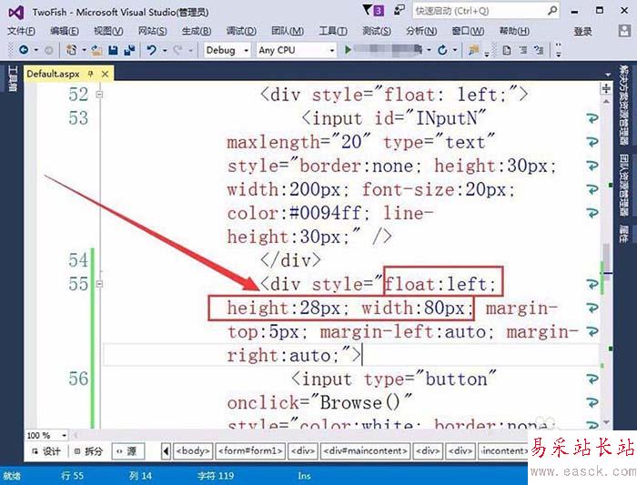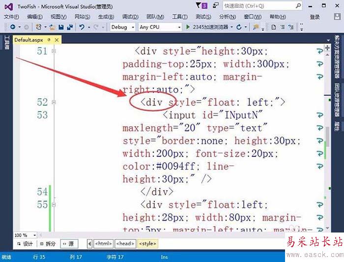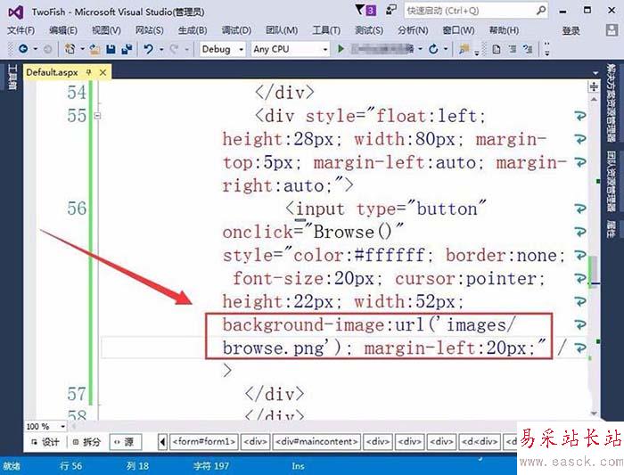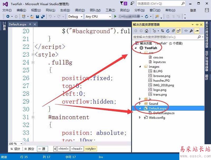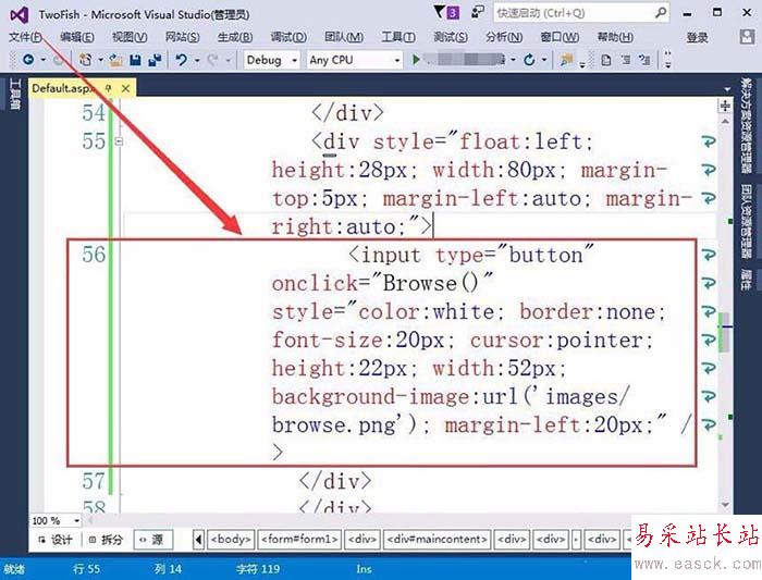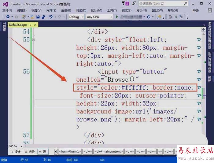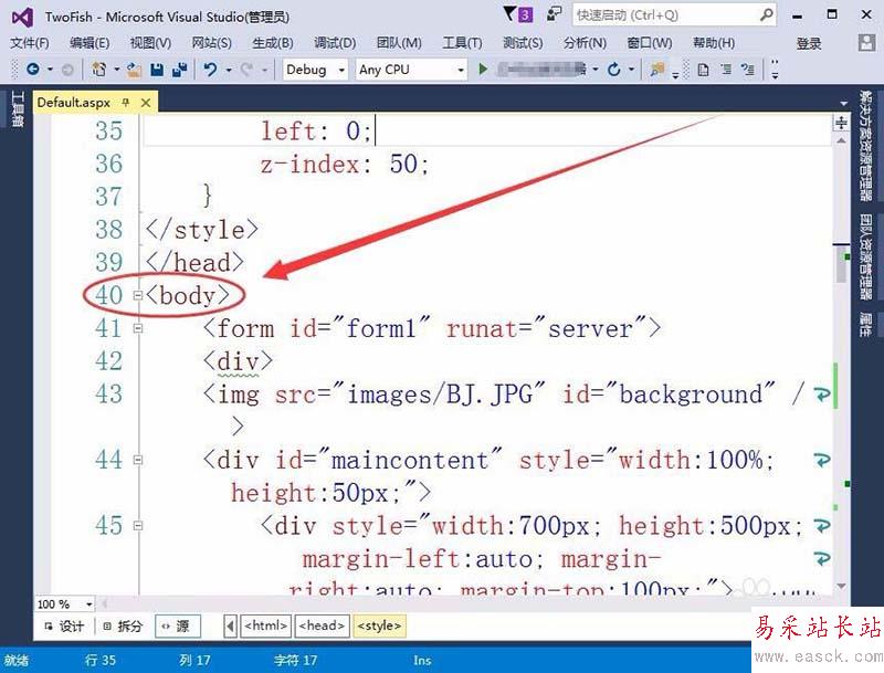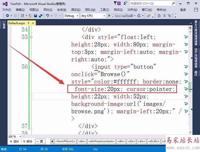 1、打開Visual Studio,創(chuàng)建一個(gè)網(wǎng)站,并打開它的首頁Default.aspx。
