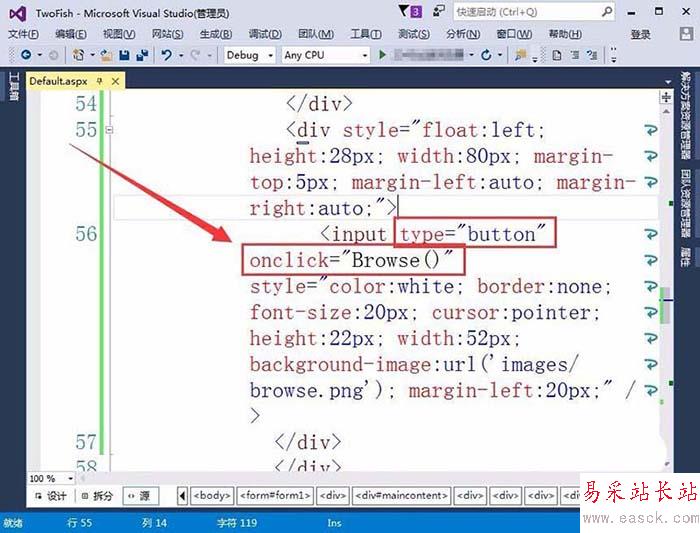 7、設(shè)置按鈕的類型為button,事件調(diào)用的方法為Browse()。