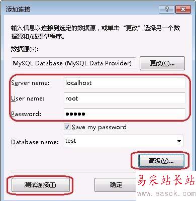 4、在彈出的方框里輸入服務器名字(默認為localhost)、用戶名、密碼和數(shù)據(jù)集的名字等,點擊測試連接,若沒有報錯,則連接成功,點擊【確定】即可。若報錯的話查看一下自己的設置是否有問題。