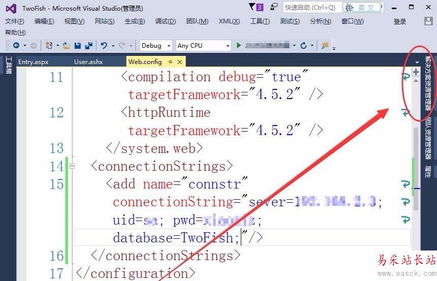 1、用Visual Studio打開一個已有的網站,單擊右側的解決方案資源管理器選項。