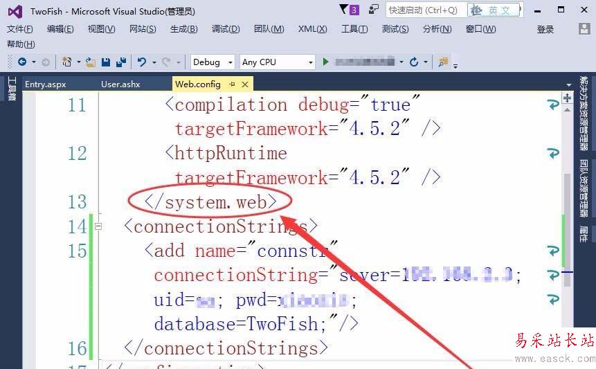 3、在左側代碼窗口中,找到system.web標簽,如下圖所示。