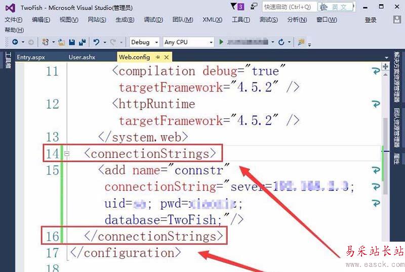 4、首先,輸入connectionStrings標簽,用來輸入配置數據庫連接的代碼。