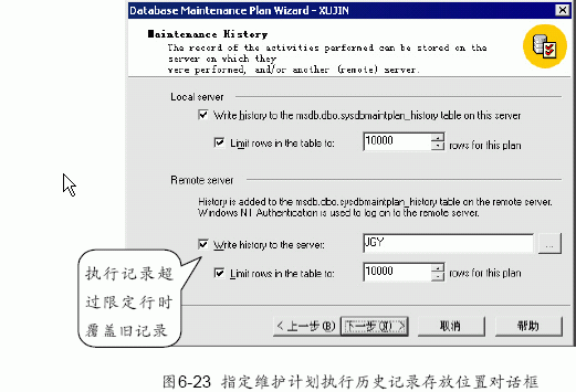 (10) 單擊“下一步”按鈕,出現如圖6-23 所示的指定維護計劃執行歷史記錄存放位置對話框。可以選擇將其存放在本地服務器或遠程服務器上。