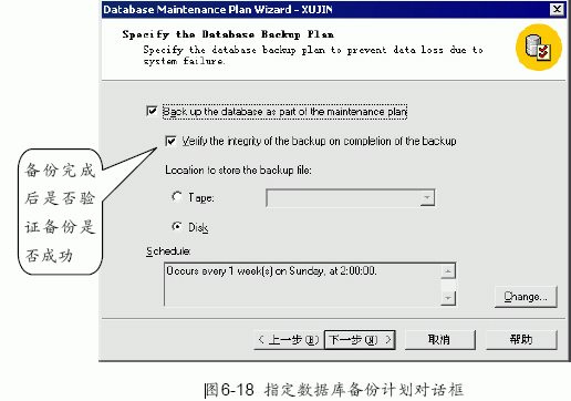 (5) 單擊“下一步”按鈕,出現如圖6-18 所示的指定數據庫備份計劃對話框。可以選擇是否將數據庫備份到磁帶或硬盤。一般都選擇將數據庫備份到硬盤。