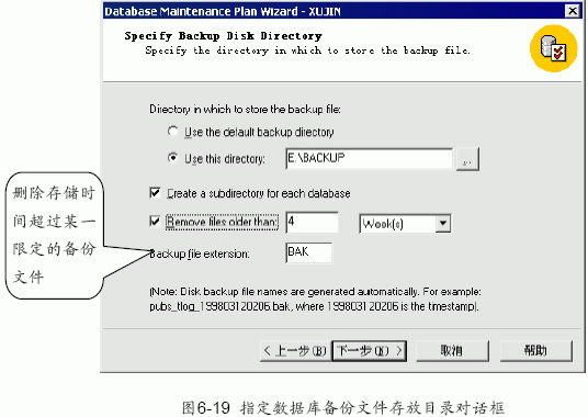 (6) 單擊“下一步”按鈕,出現如圖6-19 所示的指定數據庫備份文件存放目錄對話框。可以選擇將數據庫備份文件存放到指定的硬盤目錄,還可以給每個數據庫創建一個子目錄。