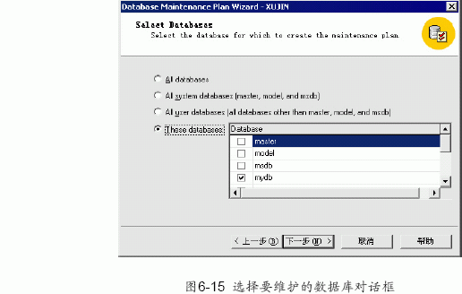 (2) 單擊“下一步”按鈕,出現如圖6-15 所示的選擇數據庫對話框。可以根據需要選擇所要維護的數據庫。