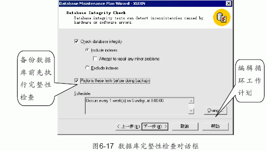 (3) 單擊“下一步”按鈕,出現如圖6-16 所示的更新數據最優化信息對話框。可以根據需要選擇是否要對數據庫的數據頁或索引頁做重整工作。單擊“change”按鈕,出現如圖6-13 所示的編輯循環工作計劃對話框。