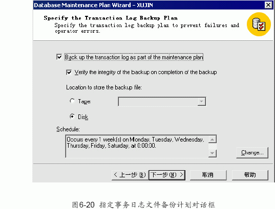 (7) 單擊“下一步”按鈕,出現如圖6-20 所示的指定事務日志文件備份計劃對話框。可以選擇是否將事務日志備份加入到數據庫維護計劃中。