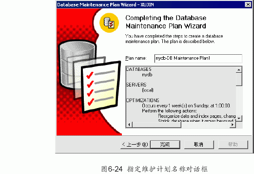 (11) 單擊“下一步”按鈕,出現如圖6-24 所示的最終界面,指定維護計劃名稱對話框。輸入名稱后,單擊“完成”按鈕,完成維護計劃的設置。