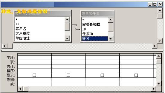 完成這兩步操作后,查詢“設計”視圖,以及它所包含的“設計網格”就將顯示在屏幕上,您所選擇的表或者查詢也將顯示在位于該視圖的上半部分的列表窗中。本章選擇的是“雇員與任務”表,以及“客戶與合同金額”表,參見圖19。